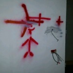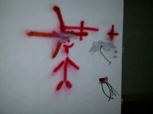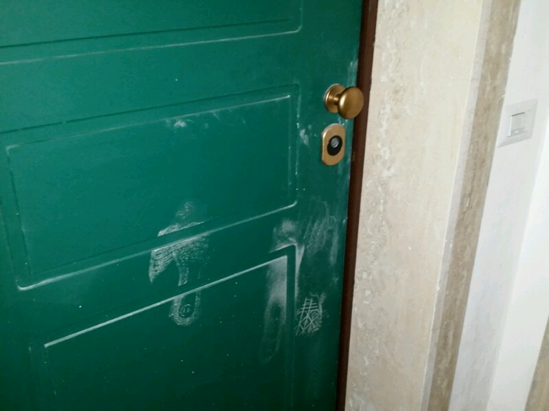 Ad aggiungere un pizzico di mistero e di inquietudine c’è poi un altro dettaglio. Gli appartamenti disabitati vengono ripuliti di tutto ciò che è possibile portare via ma non danneggiati di proposito: non c’è alcun segno di atti vandalici fini a se stessi, nessun danneggiamento volontario, nessun vetro rotto. Colpisce allora che sul muro di un’abitazione – e soltanto su quel muro – qualcuno, con vernice rossa di una bomboletta spray, abbia lasciato dei segni che per qualche malvivente potrebbero avere un significato: si tratta di una freccia, di una sagoma stilizzata di una persona e di altri due simboli composti da linee.