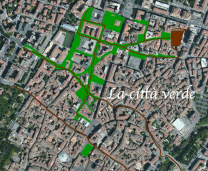 PARCO URBANO DIFFUSO Todini spiega così la proposta del Cammello: “Partiamo subito da un esempio concreto che, seppur con qualche miglioria e adeguamento, rende bene l’idea di ciò che vorremmo fare. L’area verde sotto alla Passeggiata è un parco attraversato da una pista ciclabile. Il ‘parco urbano diffuso’ del centro cittadino che prevediamo di realizzare, appunto, in sostituzione della Ztl muove da questo esempio. Da via Primo Maggio fino grossomodo a Piazza Europa buttiamo via l’asfalto per creare una nuova ambientazione verde, attrezzata con vialetti di collegamento pedonali, giochi, spazi per piccoli eventi. Un’area verde diffusa attraversata da due ‘strade carrabili’ in grado di collegare gli attuali punti cardinali della Ztl”.