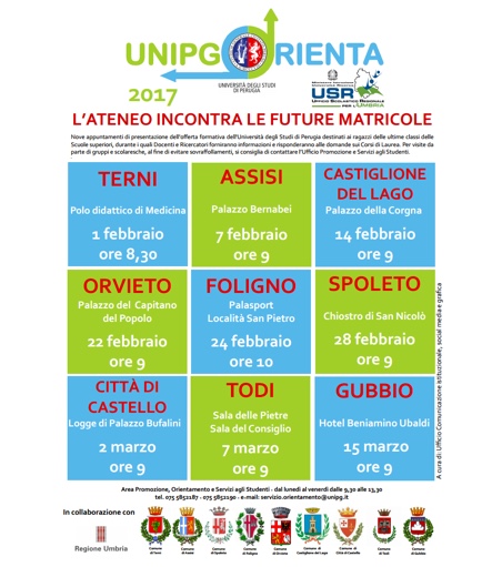 Al via il prossimo mercoledì 1° febbraio la campagna di Orientamento 2017 dell’Università degli Studi di Perugia per gli studenti delle ultime classi delle Scuole medie superiori. Anche quest’anno sarà la sede di Terni a dare inizio al programma di incontri e manifestazioni; a partire dalle ore 8.30, al Polo didattico di Medicina, sarà possibile visitare gli oltre 20 stand destinati a presentare l’offerta formativa dell’Ateneo, con uno spazio speciale riservato all’offerta formativa del Polo didattico ternano.