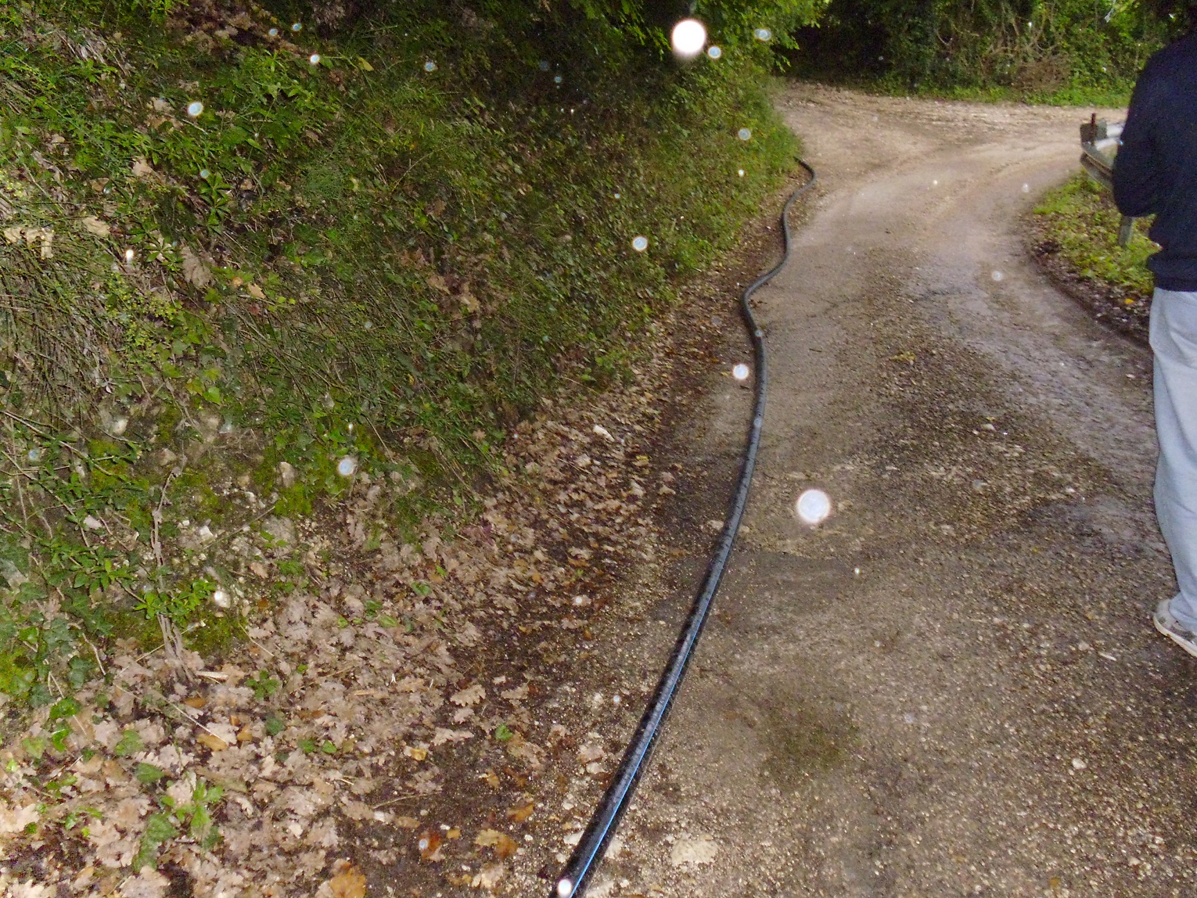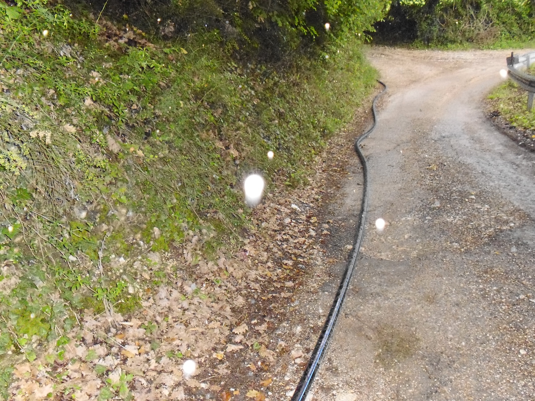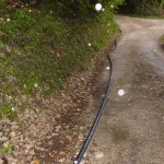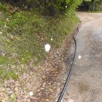 Più si sale e più la strada si stringe: nessun argine per lo strapiombo, buche che quando piove diventano vere e proprie piscine, terreno sconnesso. Ma l’assurdo arriva più o meno a metà, quando un tubo dell’acqua, con tanto di valvola e rubinetto in bella vista invade la carreggiata. “Doveva essere un tubo volante – dicono i residenti – sta qui da quattro anni”. Quel tubo è stata la “soluzione temporanea” pensata dal Sii per porre fine ai problemi dell’acquedotto che passa sotto la strada, che nel corso degli anni si è ostruito anche (ma non solo) a causa delle dimensioni ridotte, provocando cedimenti del terreno con conseguenti e ripetuti “rattoppi”: “Poi ad un certo punto, vedendo che continuavano a formarsi le buche per colpa dell’acqua, hanno ben pensato di mettere questo lungo tubo, che dopo tanti anni è ancora lì”. Il tubo è visibile per tutta la sua lunghezza e per 800 metri invade la sede stradale: “Ci sono anche le valvole e i rubinetti in bella vista sul ciglio della strada – dicono i residenti- col rischio che qualcuno possa sbandare e farsi male o peggio. Noi lo sappiamo e ci facciamo attenzione, ma chi non lo sa? Rischia di bucare una gomma, con tutte le conseguenze del caso. Chi sale col motorino, per esempio? Senza contare un altro fatto, ovvero che quelle valvole dovrebbero stare al sicuro dentro una cassetta: così all’aperto chiunque potrebbe fare un dispetto e chiuderle, lasciando a secco l’intera zona”.