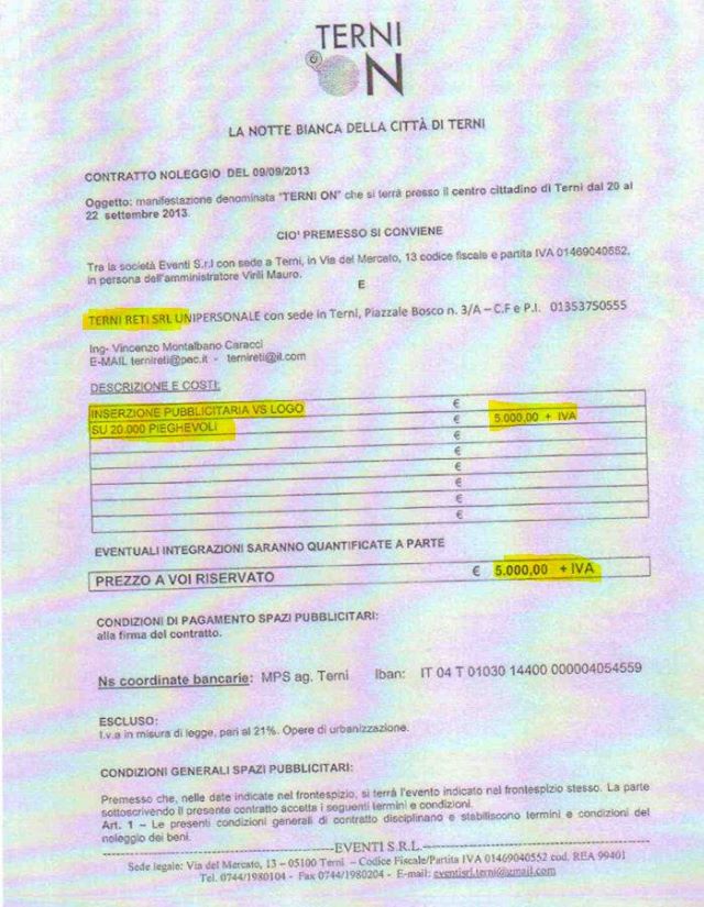 Fabbri ha pubblicato la foto contenuta in questo articolo: è il contratto di sponsorizzazione da 5 mila euro versati da TerniReti (società di proprietà del Comune di Terni, palazzo Spada detiene il 100% delle quote) per l’edizione 2013 di TerniOn. A corredo dell’eloquente documento il giornalista ha scritto: “Qualcuno, spesso, romanza o fantastica sulla polemicità dei ternani. Fin quando ci sarà qualcuno che vuol farsi gioco dell’intelligenza dei cittadini, ci sarà sempre qualcun altro che lo farà notare. E’ da osservare che TerniReti, che eppure ha sponsorizzato per 5 mila euro l’edizione 2013 di TerniOn è una società a capitale interamente pubblico (Comune di Terni), come certifica l’art.7 dello statuto della società stessa. Coerenza please. I cittadini vanno rispettati”.